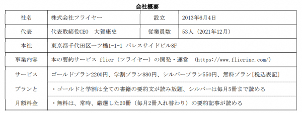 株式会社フライヤーは、本の要約サービス「flier(フライヤー)」を運営する、ITベンチャー(2013年6月設立)です。最大の特長は「書評(レビュー)」ではなく「要約」である点です。書き手の主観が入る書評とは異なり、著者の主張や論理(重要ポイントや全体像)を忠実にまとめ、読者に伝えます。書評でないため、出版社や著者から要約の許可を得る必要があり、要約した原稿にも目を通していただくことで、高品質なサービスを提供しています。