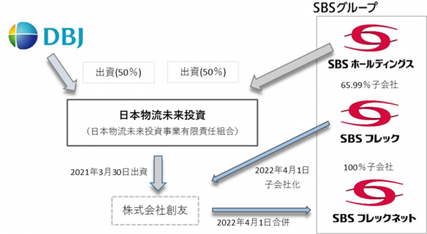 SBSフレック株式会社(代表取締役:加藤元、本社:東京都新宿区)は、2022年4月1日付で株式会社創友(代表取締役:中義泰、所在地:千葉県柏市)の全株式を日本物流未来投資(日本物流未来投資事業有限責任組合)より取得のうえ、同社とSBSフレックネット株式会社が合併したことをお知らせします。これに伴い株式会社創友の従業員は同日付でSBSグループの一員として、千葉県野田市および千葉市を拠点として活動することとなります。