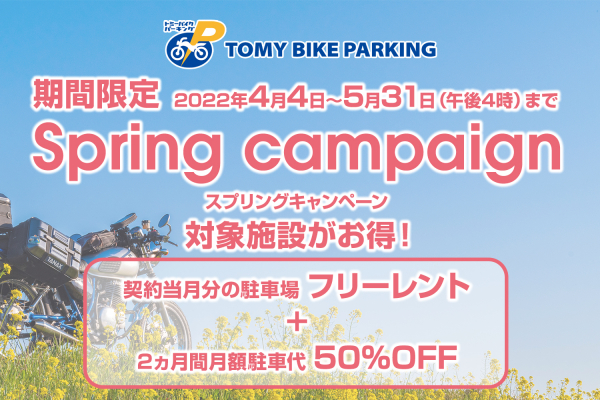 今回のトミーバイクパーキング “スプリングキャンペーン”は、5月31日(火)までの期間中、当社指定のバイクパーキングを90日以上、新規でご契約される方を対象に、契約当月分の駐車代をフリーレント(無料)とし、さらに翌2か月分の駐車代を50%OFFとする、月額駐車代が大変お得になるキャンペーンです。