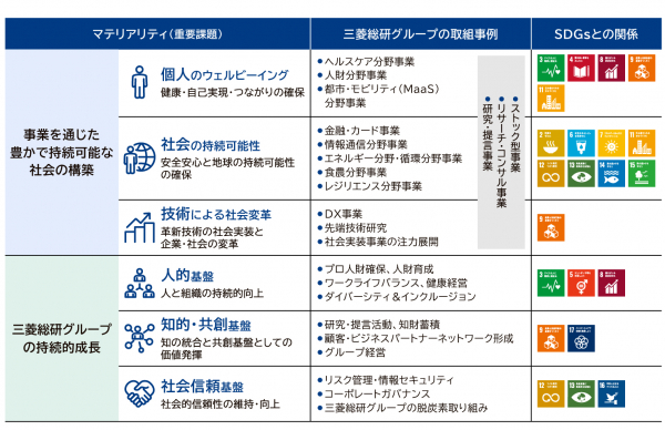 三菱総研グループは、経営理念に基づき、「100億人・100歳時代」の豊かで持続可能な社会の実現と、当社グループの持続的な成長の実現の両立を目指し、事業を通じた社会価値の創出、社会課題解決に取り組んでいます。サステナビリティ経営の推進の姿勢を明確にするため、当社グループとしてのサステナビリティ基本方針を策定するとともに、同方針のもと、サステナビリティに関する重要課題(マテリアリティ)を特定しました。また、最高サステナビリティ責任者(CSO、代表取締役社長)を設置し、責任体制を明確にしました。サステナビリティ経営に関する情報は公式サイトをご覧ください。
