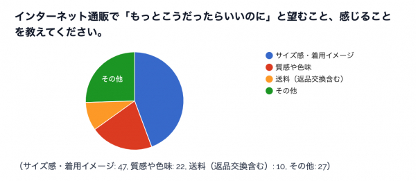 「インターネット通販に今後期待すること」を分類分けしたところでは、「サイズ感・着用イメージ」「質感や色味」の分かりやすさの向上に期待する意見が多く見受けられました。