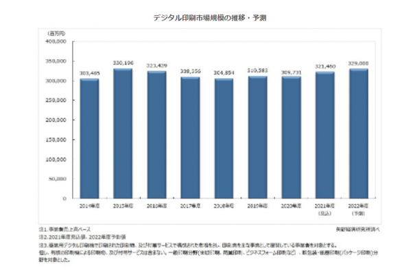 2021年度は経済活動が再開される中で、POD市場が回復基調となっており、またDPS市場も拡大が見込まれるため、2021年度のデジタル印刷市場は3,214億6,000万円(前年度比3.8%増)と増加する見込みとなっている。