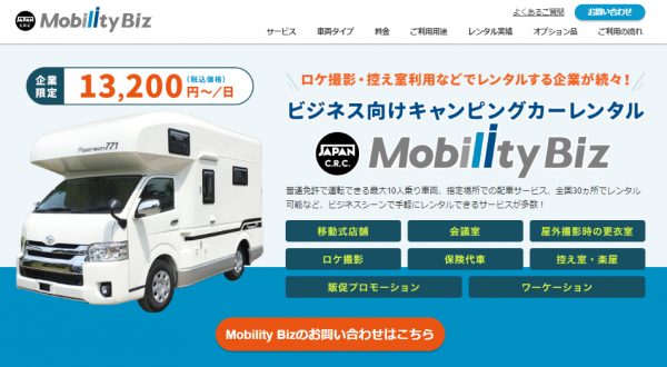 キャンピングカー株式会社(本社:東京都渋谷区、代表取締役社長:頼定 誠)が運営する「ジャパンキャンピングカーレンタルセンター(以下Japan C.R.C.)」はキャンピングカーをビジネスに活用したい企業を支援するビジネス向けキャンピングカーレンタルサービス『Mobility Biz』を2022年4月8日(金)から開始したことをお知らせします。