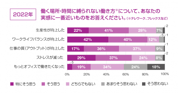 コロナ感染対策の在宅勤務を経験した会社員551人に、テレワークなど働く場所・時間に縛られない働き方を経験しての実感を聞いたところ、82%が「ワークライフバランスの向上」、66%が「ストレスの軽減」を実感していたことがわかりました。「生産性」についても63%が向上を実感。「仕事の質・アウトプット(成果)の向上」については、およそ半数が実感ありと答えた反面、残り半数は向上の実感はないと回答したことから、「仕事の質・アウトプットには変化なし」の傾向にあることがうかがえます。また、約4人に1人は「オフィスで働きたい」(24%)と実感していたこともわかりました。