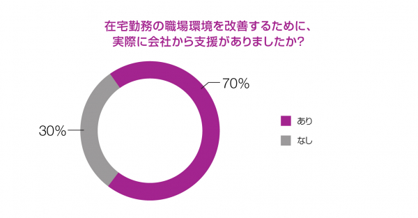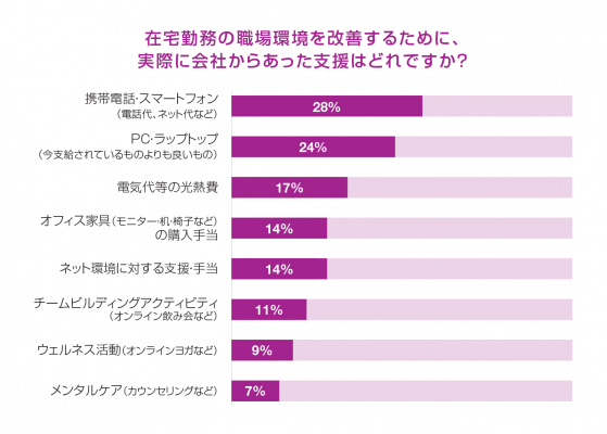 また、実際に会社から受けた支援の内容については、「携帯電話・スマートフォン(端末支給・電話代・ネット代など)」(28%)が最も多く、約3割でした。次いで、「今支給されているものより機能的なパソコン」(24%)、3位「電気代等の光熱費」(17%)という結果でした。約7割が勤務先企業より何等かの支援を受けていることがわかりました。反対に、「支援なし」は3割程でした。