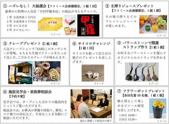 上記日時にて、葬儀プランの割引やイベントの優待特典が受けられる「ファミーユ会員(入会金・年会費・積立金不要)」の登録も随時受け付けています。お気軽にお申し付けください。