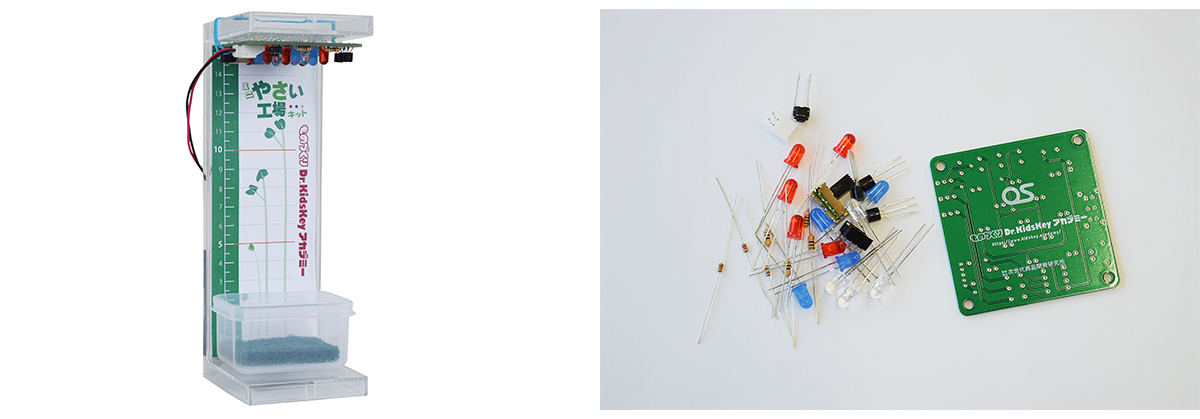はんだごてとプリント基板で作る工作キットです。エレクトロニクスと農業分野の融合をテーマに植物工場で使われている技術を活用しています。工作後は野菜の生育観察に使用することもできます。対象は小学生以上。