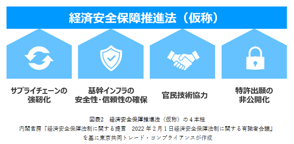 日本においては、4月7日現在、経済安全保障推進法(仮称)が衆議院本会議で可決され、参議院に送付されました。政府・与党は参議院審議を経て今国会中の成立を目指しており、2023年度から段階的に施行される見込みです。法案は(1)サプライチェーンの強靭化(2)基幹インフラの安全性・信頼性の確保(3)官民技術協力(4)特許出願の非公開化の4本柱で構成され、ハイテク分野で台頭する中国やロシアによるウクライナ侵攻など緊迫化する国際情勢を背景に、半導体などの重要物資が安定的に供給されるよう、国に企業の調達先や在庫を調査する権限などを盛り込んでいます。