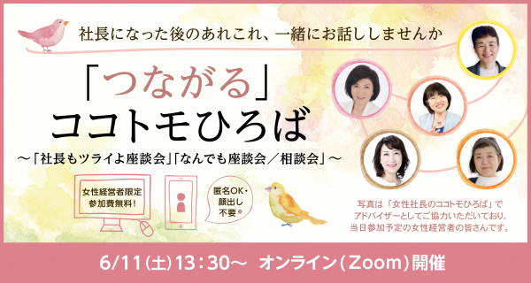 「女性社長のココトモひろば」(以下、本サービス)は、2022年6月11日(土)に、無料オンラインイベント、『「つながる」ココトモひろば~「社長もツライよ座談会」「なんでも座談会/相談会」~』(以下、本イベント)を開催します。