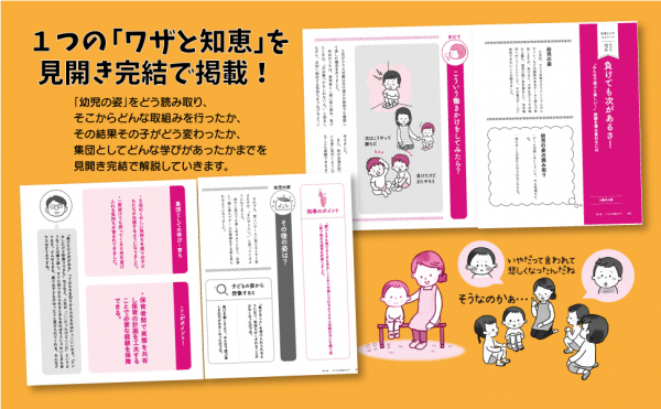 この本は、友達とどうしてもトラブルになってしまう子ども、クラスの活動に入りたくない子ども、いつも一番になりたくて、なれないと困った行動をとってしまう子どもなどなど、ちょっと気になる子ども達と毎日を過ごす保育者の方々が、一人ひとりの子どもに丁寧に目を向け、とことん考え、関わっては修正することを繰り返し、子どもとの関係をつむいでいこうとする中でみつけ出した 『知恵やワザ』 を集めて作った、これまでにない本になっております。