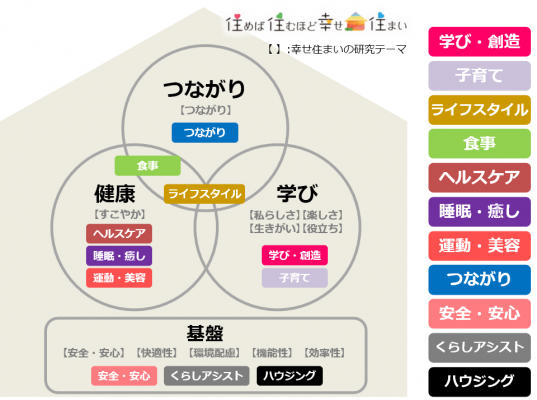 *1 健康、つながり、学び、基盤の4つのテーマは、「住めば住むほど幸せ住まい」を研究する当社の住生活研究所の研究テーマに基づいています。