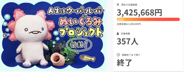 2022年3月14日~2022年4月4日に「人生はウーパールーパー」のぬいぐるみ化プロジェクトを実施、目標金額に対し300%を超えるご支援をいただき無事ぬいぐるみ化が決定致しました。ご支援を頂いた皆様にお礼申し上げます。