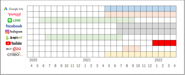 検索広告、ディスプレイ広告からはじまり、 YouTube 広告 、 Criteo 広告、 Logicad 広告、 LINE 広告、 教えて!goo 広告など様々なネットワークでテストを繰り返しながら取り組んでいます。