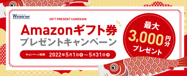 Winserver(ウィンサーバー/運営会社:アシストアップ株式会社)は、2022年5月1日(日)~5月31日(火)の期間、Amazonギフト券プレゼントキャンペーンを実施いたします。