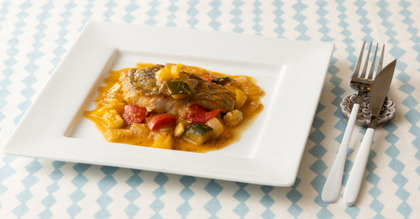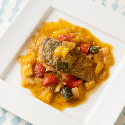 身のしっかりした鳥取県産のスズキに下味をつけて油でカリッと焼き上げたポワレに、黄パプリカやズッキーニなど夏野菜を使い、風味づけにバジルを入れてさわやかな味わいに仕上げています。スズキのシンプルな白身とオリーブオイルベースのソースは相性抜群。さわやかなバジルの香りが料理を一層引き立ててくれています。こちらの商品は、お魚とソースを分けて包装していますので、一緒に湯銭調理して、お皿にスズキをのせてその上からたっぷりラタトゥイユソースをかけてお召し上がりください。