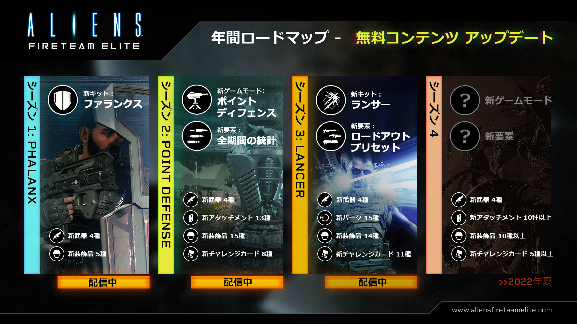 株式会社3goo(サングー)(本社:東京都渋谷区、代表取締役:ディ・コスタンゾ ニコラ)は、映画シリーズ「エイリアン」の世界を舞台とするゲーム『Aliens: Fireteam Elite(エイリアン:ファイアーチーム エリート)』のシーズン3の新たな無料大型アップデート「ランサー」を本日4月20日(日本時間)よりPlayStation(R)5およびPlayStation(R)4版にて配信開始いたしました。本作はアクションゲームやシューティングゲームの制作に携わってきたベテランの開発者たちから成る、アメリカのカリフォルニア州サンノゼを拠点とするゲームスタジオCold Iron Studioが、20th Century Gamesと協同で、世界各国でのリリースを発表している協力型三人称視点サバイバルシューティングゲームで、プレイヤーたちはゼノモーフの脅威を駆逐するための絶望的な戦場へ送り込まれる事になります。シーズン3のコンテンツについては以下の詳細をご覧ください。
