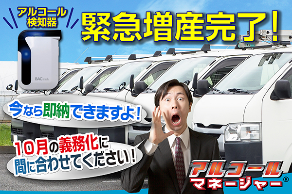 この度、道交法改正に伴う「アルコール検知器」の品薄状態に際し、いち早く商品の増産を完了いたしました。一人でも多くの安全運転管理者様およびドライバーの皆さまのお役に立てますよう、今後も尽力してまいります。」
