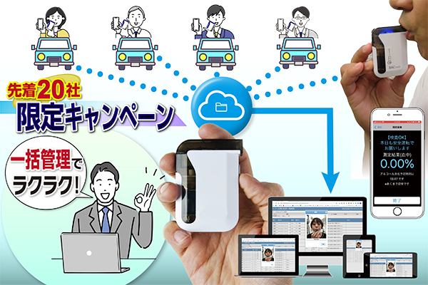 「アルコール検知器導入支援キャンペーン」といたしまして、先着20社に限り、即納対応が可能です。「アルコール検知器」による確認が義務化される10月に間に合わせたいという企業様、数に限りがございますので、どうぞお急ぎください。