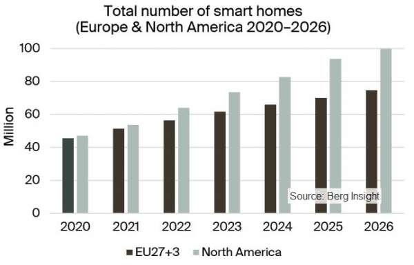 Berg Insightは発表資料において、欧州と北米におけるホームオートメーションシステムの出荷数とサービス料金の収益は2021年の688億ドルから2026年には1,297億ドルに達し、年平均成長率は13.5%での成長になると予測しています。