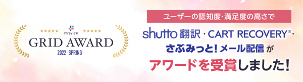 “おもてなしを科学する”株式会社イー・エージェンシー(本社:東京都千代田区、代表取締役:甲斐真樹)が提供するWebサイト翻訳サービス「shutto翻訳(しゅっと ほんやく)」ならびにカゴ落ち特化型MAツール「CART RECOVERY」、「さぶみっと!メール配信」は、は、2022年4月20日に発表されましたアイティクラウド社主催の「ITreview Grid Award 2022 Spring」において、ユーザーから高い評価を受け、それぞれの部門でアワードを受賞しました。