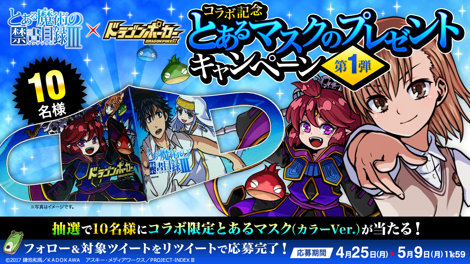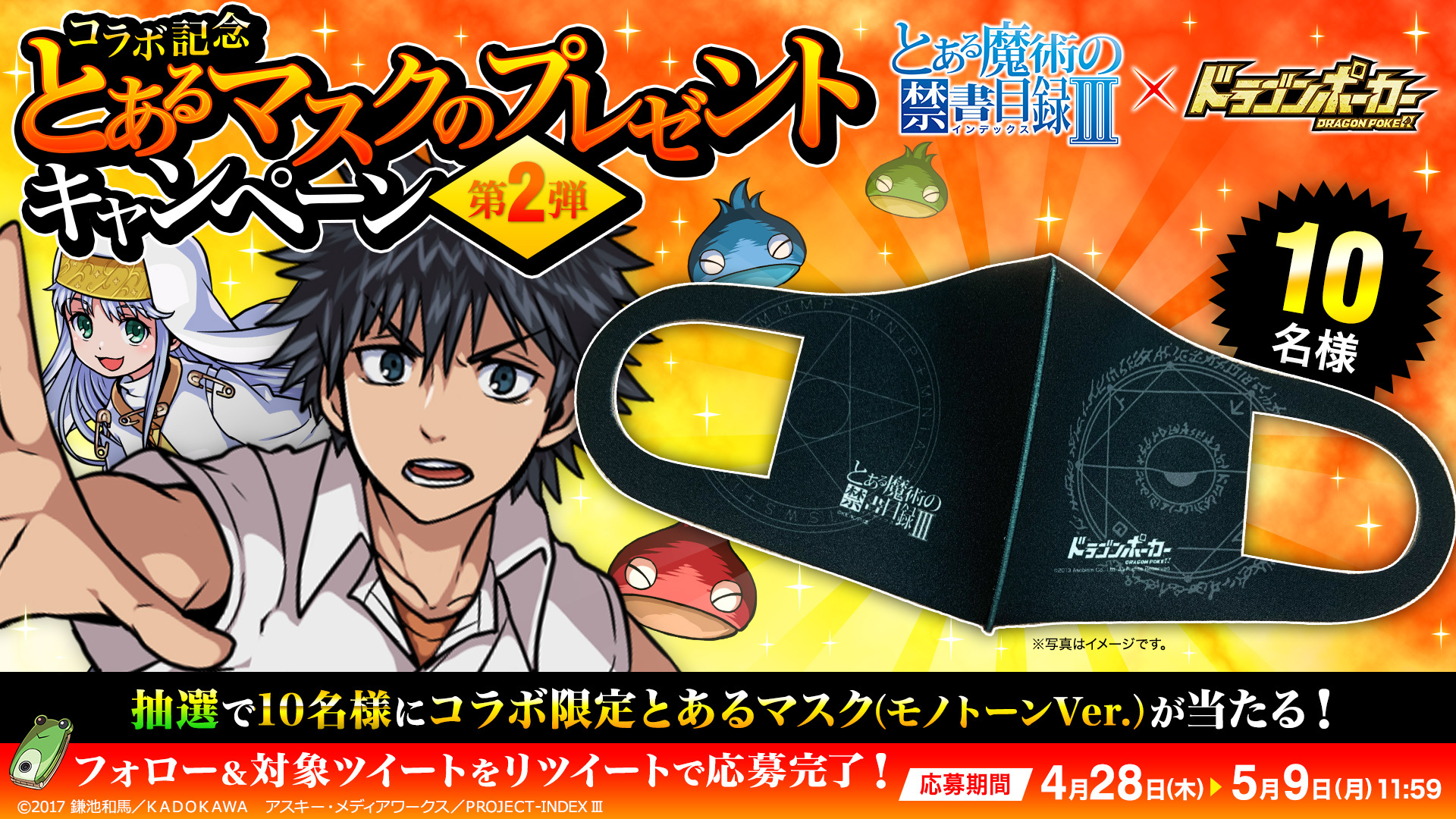 期間中、『ドラゴンポーカー』公式Twitterアカウント(@DragonPoker_aso)が投稿した、キャンペーン対象ツイートをリツイートしていただいた方の中から抽選で、コラボ限定とあるマスクをプレゼント!ふるってご参加ください。