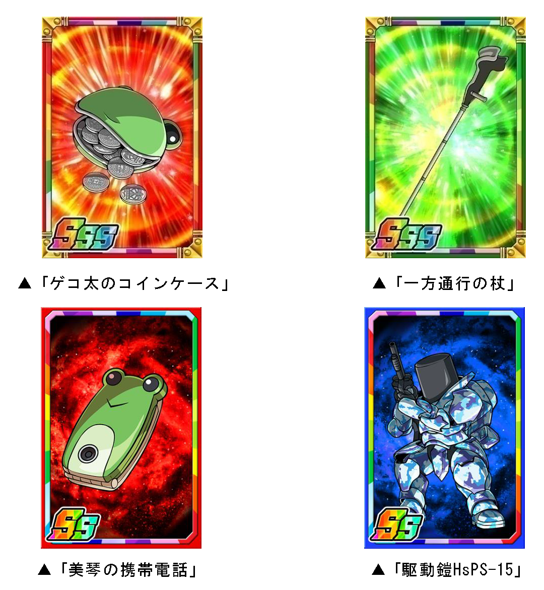「禁書目録 P」を貯めるとその累計ポイント数に応じた、限定子分カード「ゲコ太のコインケース」「一方通行の杖」を手に入れることができます。 また、スペシャルダンジョンのボスを倒すと、まれに新たな限定子分カード「美琴の携帯電話」「駆動鎧HsPS-15」や「ルーンカード」「七天七刀」「電子ゴーグル」を手に入れることができます。この5つの限定子分カードは、複数枚集めると進化ができ、子分スキルの効果が強力になります。