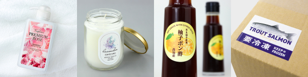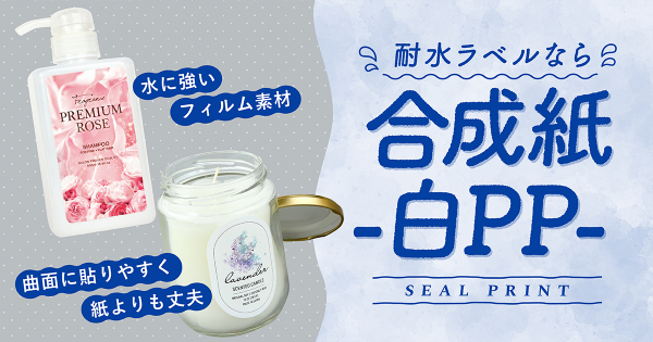 合成紙-白PP-とは、ポリプロピレンでつくられた白地のフィルム素材です。紙素材よりも破れにくく、耐水性があるため、食品や水回りでの商品ラベルにおすすめです。フィルム素材の中でも比較的柔らかく、曲面に貼り付けやすいのが特徴です。そのため、シャンプーボトルラベル・キャンドルラベルシール・ドレッシングラベル・冷凍食品梱包ラベルシールなどの使用が可能です。