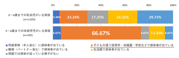 0~4歳までの乳幼児がいる家庭では、「同居家族に感染者が出ている」「子どもの通う保育所・幼稚園・学校などで感染者が出ている」があわせて28.73%であるのに対し、5~6歳までの未就学児がいる家庭では、「同居家族に感染者が出ている」「子どもの通う保育所・幼稚園・学校などで感染者が出ている」があわせて73.34%(+44.61pt)と、感染と隣り合わせにある状況がわかる。このことからも、今回の接種対象を5歳以上に拡大した意図が伺える。