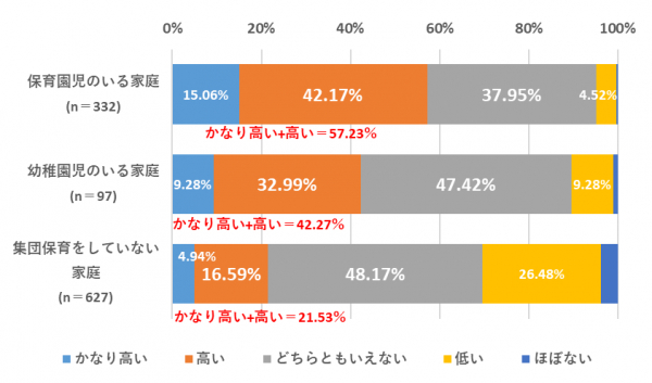 その結果、お子さまの感染リスクが「かなり高い」及び「高い」と感じている割合は、「保育園児のいる家庭(n=332)」では57.23%、「幼稚園児のいる家庭(n=97)」では42.27%となり、「集団保育をしていない家庭(n=627)」では21.53%となった。