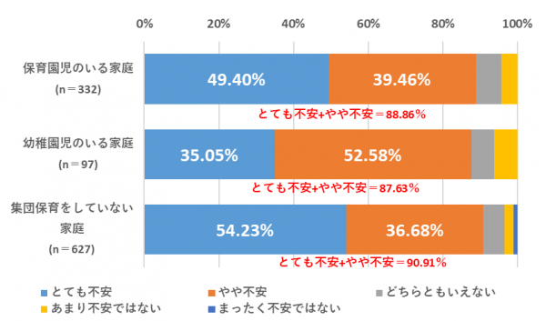 しかし、お子さまのコロナ感染への不安度を同じく「保育状況別」に聞いたところ、お子さまへの感染が「とても不安」及び「やや不安」と感じている割合は、「保育園児のいる家庭」では88.86%、「幼稚園児のいる家庭」では87.63%、さらに「集団保育をしていない家庭」では90.91%となった(図3)。