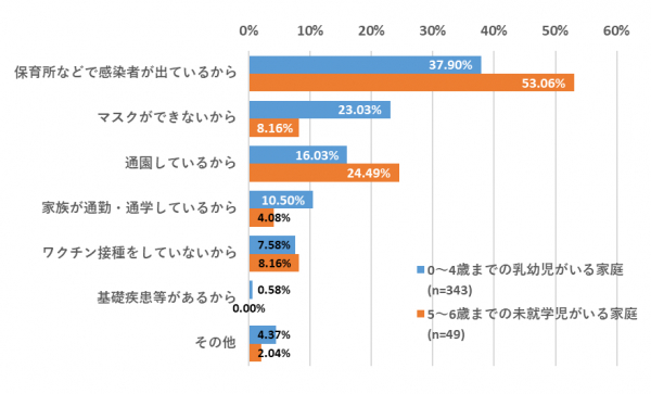 0~4歳までの乳幼児がいる家庭では最も多いのが「保育所などで感染者が出ているから(37.90%)」で、次いで「マスクができないから(23.03%)」となった。