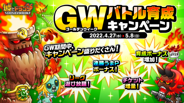 株式会社アソビズム(本社:東京都千代田区、代表取締役:大手智之)は、App Store・Google Playにて好評配信中の『城とドラゴン』で、2022年4月27日(水)より「GWバトル育成キャンペーン」を開催いたします。