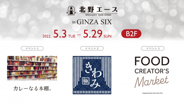 レトルトカレーを本棚のように並べた「カレーなる本棚(R)」、日本の風土が生み出した伝統食から新しい味わいまでを集めた「きわみ」、週ごとに変わる「フードクリエイターズマーケット」と、北野エースの魅力を凝縮しました。こだわりの味をGINZA SIXからみなさまにお届けします。