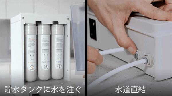 水道に接続すれば、水を入れる手間が省けます。貯水タンクは4Lで、ウォーターサーバーとしてもお使いいただけます。