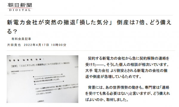 ロシアのウクライナ侵攻により、天然ガスや原油などの価格が高騰し、同時に卸電力市場の価格が高騰しています。それにより、調達が難しくなった新電力会社の撤退が増加しています。4月17日配信の朝日新聞デジタルでは、新電力会社と契約していた個人宛に届いた、電力小売り事業者からの撤退を知らせるメールの紹介から始まり、新電力倒産の背景や、撤退への備えについて紹介しています。記事のなかで、契約する新電力の撤退への備えや新電力の選び方について、RAUL株式会社 代表の江田健二が専門家としてアドバイスいたしました。