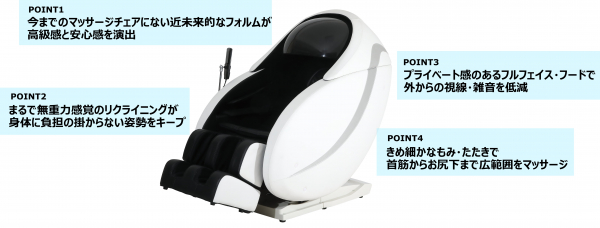 当社の業務用マッサージチェア「あんま王」は、家庭用とは異なる業務用に特化した機能を追求し続け、業務用として国内トップのシェアを誇ります。高耐久性やスピーディな補修体制はもちろんのこと、パブリックな空間にいながら外部の視線を気にせず使える“フルフェイスフード”など業務用として多くの方に使用していただくための性能を追求してきました。家庭用では見られない大型サイズや、これまでのマッサージチェアにはない近未来的なデザインも人気の理由です。