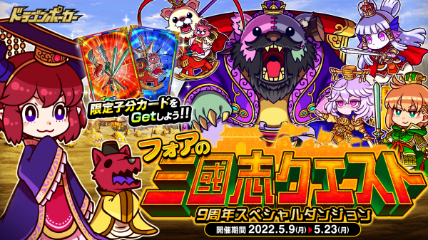 株式会社アソビズム(本社:東京都千代田区、代表取締役:大手智之)は、App Store・Google Playにて好評配信中のリアルタイム合体カードバトル『ドラゴンポーカー』で、2022年5月9日(月)より9周年スペシャルダンジョン「フォアの三國志クエスト」を開催いたします。