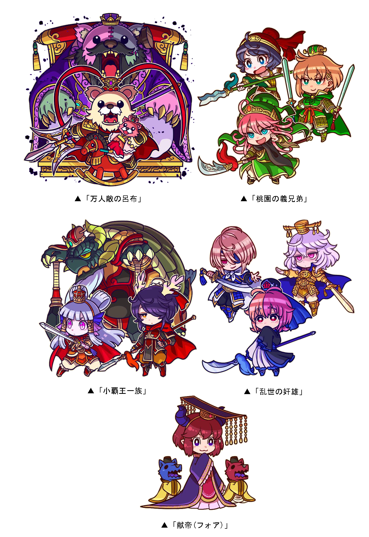 本ダンジョンには、ボスとして「万人敵の呂布」が出現します。また、道中には「桃園の義兄弟」「小覇王一族」「乱世の奸雄」などが出現し、クリアした際に手に入る「9周年P」を貯めると、DRAレア「献帝(フォア)」などと交換できます。