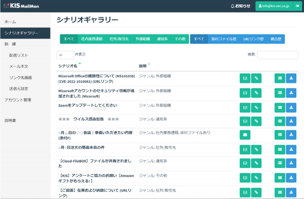 ・協会や団体の注意喚起や流行りの攻撃メールも参考に訓練シナリオギャラリーの随時Update。ご希望の訓練内容がある場合は、作成代行もお受けします。