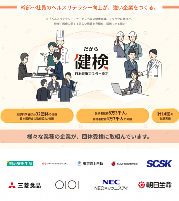 日本健康マスター検定は、経済産業省認定「健康経営銘柄/健康経営優良法人」評価指標の一つ、「ヘルスリテラシーの向上」の具体策として、【健検】の受検者数・合格者数などが記載できる資格試験です。