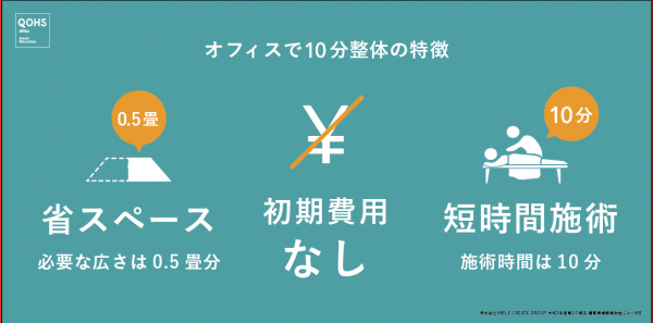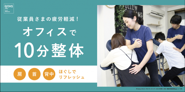 「QOHS(クオース)」のサービスは、企業様の需要に合わせ提案いたします。整体師が定期的にオフィスに伺い、従業員の身心の疲れやストレスを軽減する福利厚生向けサービスとなります。