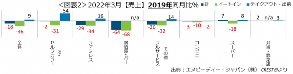 外食・中食市場の2022年3月は、売上18.3%減(2019年同月比)