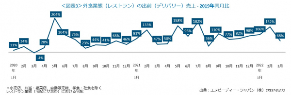 外食業態計(レストラン計)の出前(デリバリー)売上2019年同月比をみると(図表3)、プラス成長が続いています。デリバリー増加のピークは2020年5月の204%増ですが、その後も2ケタ増が続き、特に2021年2月(132%増)、同5月(159%増)、同7月(181%増)、さらに同9月も109%と大きく伸びました。年が明けて、2022年1月は106%増、2月は152増%と2ヶ月連続で3ケタ増となり、3月は68%増でした。