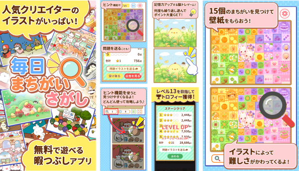 日本発の人気クリエイターのイラストで楽しむ、まちがいさがしアプリです!