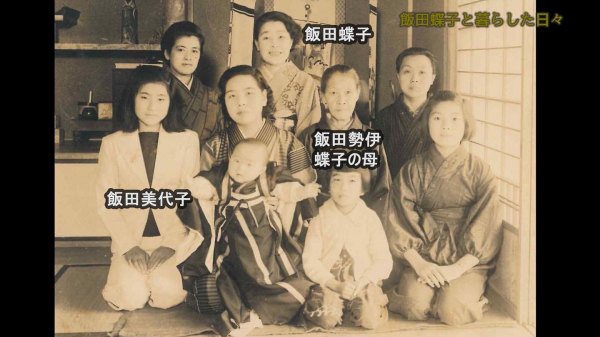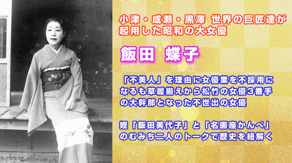 今回、実の姪である飯田美代子(現在91歳)と飯田蝶子の研究家「のみむち」氏との対談を通して飯田蝶子の生きざまと魅力を描いた番組を制作、戦前の映画史としても貴重な内容となっている。