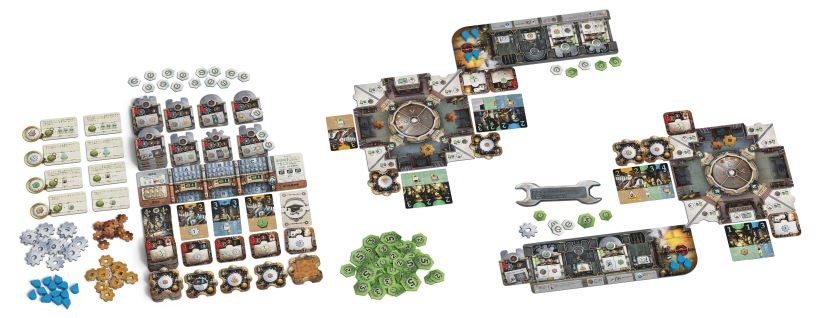 ●内容物:ディスプレイボード1枚、プレイヤーボード4枚、工場ボード4枚、技師カード48枚、装置トークン72枚、歯車72枚、褒賞トークン16枚、時計トークン8枚、得点マーカー96枚、木製水トークン20個、レンチトークン1枚、得点記録用紙1冊、ルールブック1冊