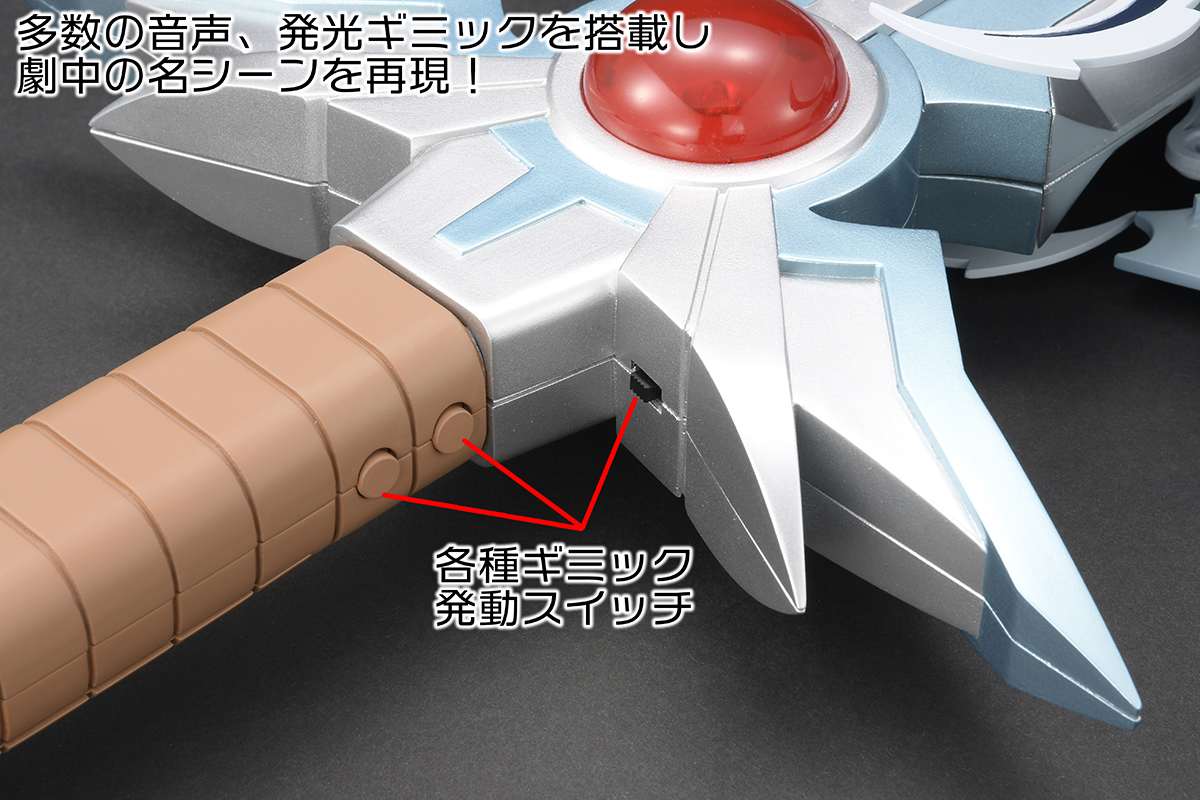 LEDによる発光ギミックやBGM、ダイ役の「種崎敦美」氏による撮り下ろし音声など、様々なギミックが盛り込まれた1/1スケールのプロップアイテムとなっている。