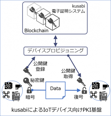 kusabi は、改ざんすることができないブロックチェーンに公開鍵を登録することにより、従来の認証局モデルにとらわれない論理的認証を実現し、ソフトウェアのみで IoT デバイスの真正性を保証します。