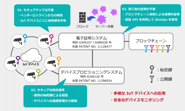 このたび、米国で取得した特許は、2018 年 5 月に日本国内で取得した、ブロックチェーンを利用した新 PKI 技術となる「電子証明システム」を支援し IoT デバイスからパスワードを撤廃する OTA(無線通信:Over-The-Air)をソフトウェアで実現する「デバイスプロビジョニングシステム」(特許第 6340120 号)と同様のものです。