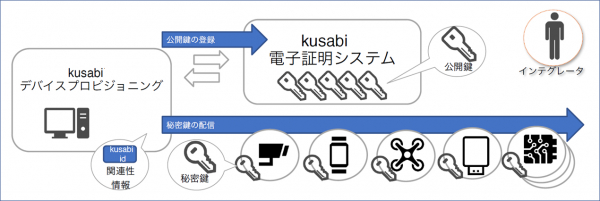 kusabi は、あらゆる「モノ = IoT(モノのインターネット:Internet of Things)」の安全な相互通信を目指した世界初(※)の新 PKI(公開鍵基盤:Public Key Infrastructure)技術を提供し、IoT のシステムモデルに最適なセキュリティを実現します。(※当社調べ)